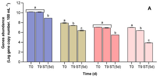 To determine the abundance of 16S rRNA, intI1, and the ARGs sul1 and blaTEM, a quantitative polymerase chain reaction (qPCR, StepOneTM Real-Time PCR System, Life Technologies, Carlsbad, CA, USA) was performed in duplicate for each DNA extract []. Quantification was attained in duplicate through a standard curve method as described in a StepOne™ Real-Time PCR System (Life Technologies, Carlsbad, CA, USA) [], and to avoid any probable qPCR inhibition, target genes were evaluated in a serially diluted sample []. The abundance values of each gene (GA) were expressed as the average of log gene copy number per 100 mL, and the intI1 and ARGs prevalence was determined according to normalization with the respective 16S rRNA abundance values (GA copy number per 100 mL/16S rRNA gene copy number per 100 mL). Moreover, the percentage of reduction of resistance genes (RRG) was calculated as presented in Equation (1): where GAT0 corresponds to the GA at the beginning of the experiment (T0), and GAT9 to the GA on the last day (T9).