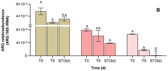 Due to the promising results of AMS in the C− PBR, the treated water was tested for its stability in terms of 16S rRNA, intl1, and ARG content (Figure 9), envisioning a possible treated water reutilization scenario. Storage revealed a decrease of 16S rRNA abundance (Figure 9A), as well as a reduction of intl1, sul1, and blaTEM abundance, with log reductions of 1.0, 0.7, and 2.5, respectively, when compared to values obtained at the end of the experiment (T9), corresponding to an RRG of 97.1, 94.2 and 99.9% from the beginning of the assay (T0) up to the end of the storage period (ST5d). Microalgae surface adsorbed bacteria co-precipitation might have had a role in this reduction, probably by a reconfiguration of the bulk water microbial composition [].