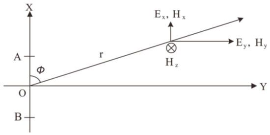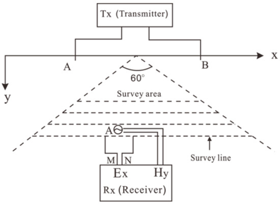 CSAMT is a frequency–domain electromagnetic depth-sounding method. By taking the finite length ground electric dipole as the field source, the electric- and magnetic-field parameters can be simultaneously observed at a certain distance from the dipole center, the Cagniard resistivity and impedance phase can be calculated, and the geological objects can be detected at different burial depths. The EMF components measured by CSAMT and the coordinate system are displayed in Figure 3. The CSAMT-based scalar measurement was realized using the power from an electric dipole source, and the observation point was located in the sector area formed by 30° angles at two sides of the middle perpendicular to the electric dipole source (Figure 4) [31].