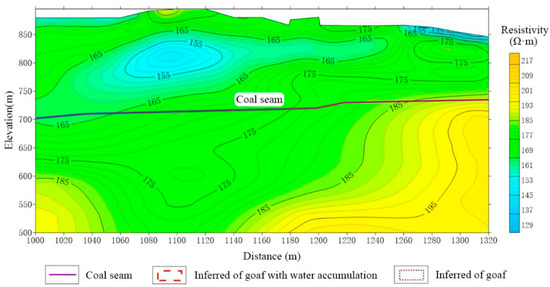 As observed from the transverse direction of the apparent resistivity contour line on the cross-sectional diagram (Figure 8), an evident low-resistivity anomaly appeared within points 1052–1225 on the line distributed along the coal seam, and the apparent resistivity was lower than 150 Ω·m. This finding was considered as the reflection of the low-resistivity anomaly triggered by the water accumulation in the goaf at the low-lying part of the formation. An obvious high-resistivity anomaly was presented within points 1253–1326, and the apparent resistivity was higher than 200 Ω·m, which was inferred as the reflection of the anomaly in the coal goaf without water accumulation. Points 1225–1253 were located between the water accumulation area and the goaf, which was inferred as the transition zone from the water accumulation area to the non-water-accumulation area in the goaf.