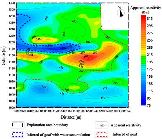 The blue–green–yellow–red transition displayed on the section map denoted the change in apparent resistivity from low to high, as shown in Figure 9. According to the overall change laws of apparent resistivity, the range encircled by the blue dotted line in the bedding section map of apparent resistivity represented the water accumulation in the goaf and that encircled by the red dotted line was the goaf. The non-encircled area was the unexploited range.