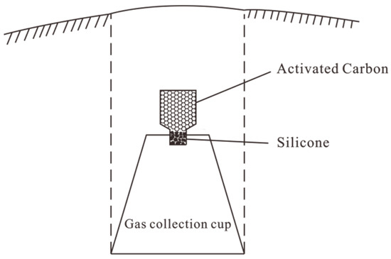 The instrument used was an HD-2003 activated-carbon radon detector. In the field survey, the used activated carbon was baked and dried. After cooling, the activated carbon was placed in a sampler according to an appropriate standard, a silicon stopper was used to evade the influence of underground moisture, and then the sample was sealed for later use. Next, the filled sampler was placed in a test pit with its mouth down, as shown in Figure 10. The sampler and gas-collection cup were stabilized and fixed, the plastic cloth was covered on them, and the pit mouth was sealed. When the cup was buried until the preset time (at least 5 days) was reached, the sampler was taken out, and the sampling time and the climate were carefully filled. Afterwards, the sampler was placed in the tested and calibrated activated-carbon radon detector, and then the line number and point number of each sampler were recorded.