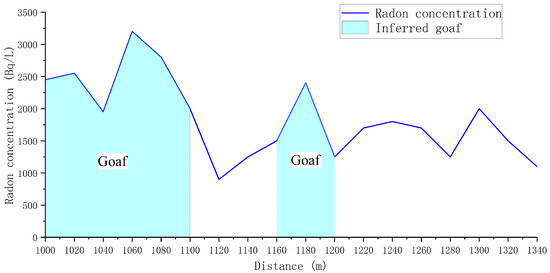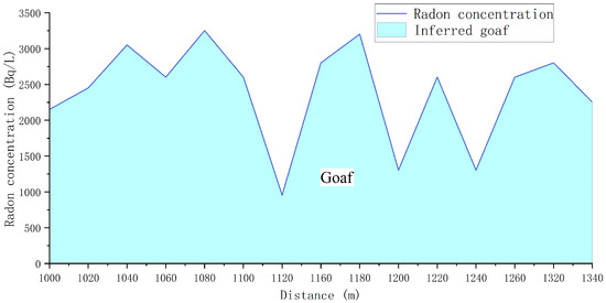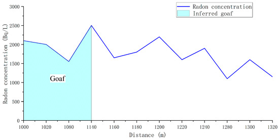 The profile map (Figure 11) of radon measurement by activated carbon shows that the radon anomaly was obvious. The maximum radon anomaly was 2495.08 Bq/L, and most radon values within points 1160–1320 were smaller than 2000 Bq/L, whereas those at points 1000–1140 were greater than 2000 Bq/L, manifesting the evident radon anomaly. By comprehensive analysis, point 1140 was delimited as the goaf boundary.