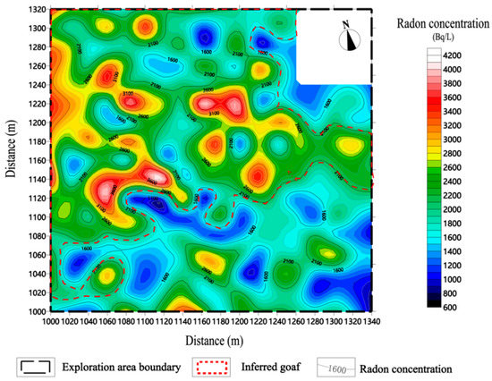 By combining the contour lines of radon values measured by the activated-carbon method and the following interpretation result map, the radon anomaly was found to have a blocky shape with favorable continuity, as shown in Figure 14. The radon values greatly changed in the middle and northwest parts of the exploration area, and the maximum radon concentration was 3962.3 Bq/L which was interpreted as a radon anomaly zone. Moreover, the ground-surface fissures may have already been connected to the underground goaf to some extent without a gas storage function, so low values appeared in a small block in this section. Comprehensive speculation and analysis revealed that the anomaly zone was largely identical to the goaf range inferred by CSAMT, and the goaf was inferred as the radon anomaly zone.