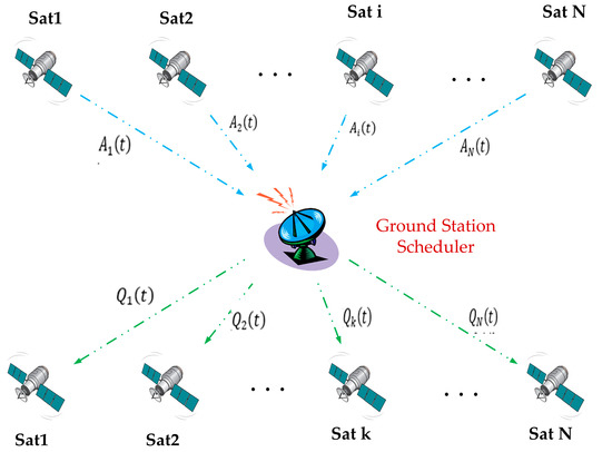 Then, at time slot , the amount of data in the th satellite’s task queue can be expressed as and is given by the following expression