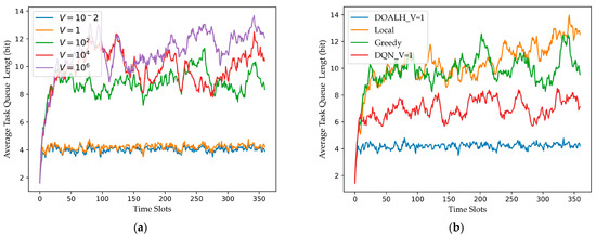 As we have previously analyzed, the value of has a crucial impact on both the task queue length and the performance of the algorithm. As shown in Figure 3, (a) Average task queue length per satellite vs. of DOALH algorithm; (b) Average task queue length per satellite vs. different algorithms. Figure 3a, when the value of is small, the queue can be kept stable directly. However, when the value of is large, the queue grows gradually and eventually converges to an approximately stable state. The stable length of the queue convergence is positively related to the value of . As Figure 3b reveals, among the different algorithms, the DOALH algorithm guarantees the optimal solution for at each time slot, resulting in the shortest average queue length. The DQN algorithm adopts as the reward function, which also guarantees the convergence of the queue to a lower value. The Greedy algorithm also results in a shorter queue length compared with the Local algorithm due to its greedy strategy. The Local algorithm generates a large queue buildup because it only considers Local processing and does not make rational use of other available satellite resources.