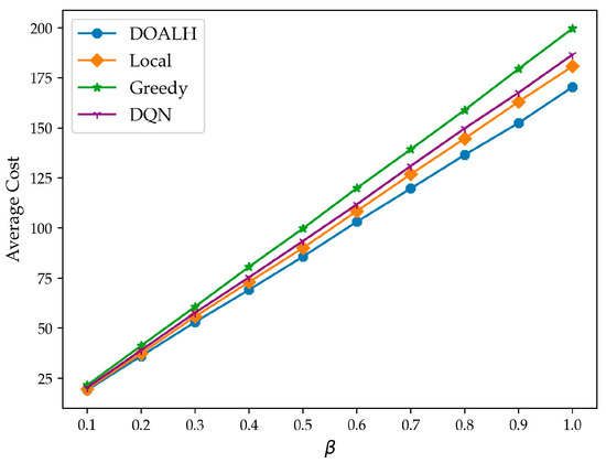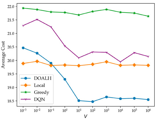 According to Figure 4, the Greedy algorithm attains the highest average cost, primarily because it solely focuses on achieving an improved balance in the queue without considering the costs associated with delay and energy consumption resulting from ISL transmission. The Local and Greedy algorithms are simpler and are not impacted by the value of , enabling them to maintain a consistent trend. However, both the DQN algorithm and the DOALH algorithm exhibit a substantial decreasing trend as the value of increases. Eventually, they converge to a stable value. This phenomenon can be attributed to the fact that as the value of increases, the algorithm places more emphasis on minimizing the incurred by the task, which allows it to achieve a more optimal solution. The simulation results align with the preceding analysis of the algorithm. Thus, should be chosen for a good trade-off between the overall and the required task queue length.