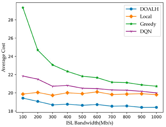 The bandwidth of the ISL has a significant impact on the computational offload. In order to simulate both conventional band communication rates and possible future laser communication rates, the bandwidth was set between 100 and 1000 . This allows for an accurate assessment of the transmission capabilities of the link in relation to the offloading . The Local algorithm has remained largely unchanged, as it excludes the possibility of offloading tasks to other satellites for computational assistance. Changes in the bandwidth of ISLs do not have an impact on this algorithm. However, the other three algorithms have undergone various modifications. Specifically, the Greedy algorithm changes most significantly because it prioritizes offloading tasks to the satellite with the smallest queue for processing. Additionally, the DOALH algorithm still performs best, as depicted in Figure 7.