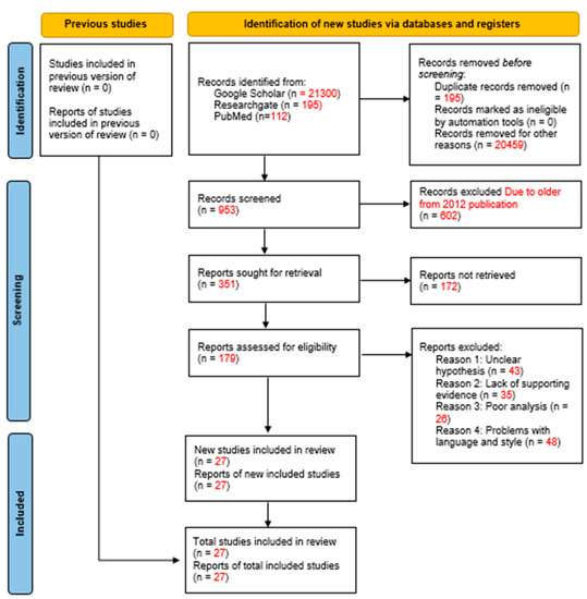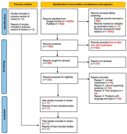 In the third category of our review, we conducted a search using Google Scholar, which initially provided us with a total of 20,800 findings, and 688 records were identified from PubMed. After the first screening process, which involved filtering out duplicates and matching records, we concluded with 1458 works. The second screening process narrowed down the number of works to 656 and focused on finding works published after the year 2012 related to the first category. During the third screening process, we assessed the eligibility of 282 works and further narrowed down the list to 17 records during the fourth screening process. This final list consisted of works that had a clear hypothesis, adequate supporting evidence, and high-quality analysis. We excluded works that had problems with language, poor analysis, or lacked sufficient evidence (Figure 3).