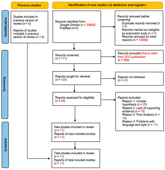 To conduct our search for the second category of our review, we utilized Google Scholar, which yielded an initial result of 20,600 findings. Following the first screening process, which involved eliminating duplicate and matching records, we were left with 711 works. The second screening process was focused on finding works published after 2012 and resulted in narrowing down the pool of works to 125. During the third screening process, we assessed the eligibility of 84 works and further narrowed down the list to 11 records during the fourth screening process. The final list of works included those that had a clear hypothesis, adequate supporting evidence, and high-quality analysis, whereas works that had problems with language, poor analysis, or lacked sufficient evidence were excluded (Figure 2).
