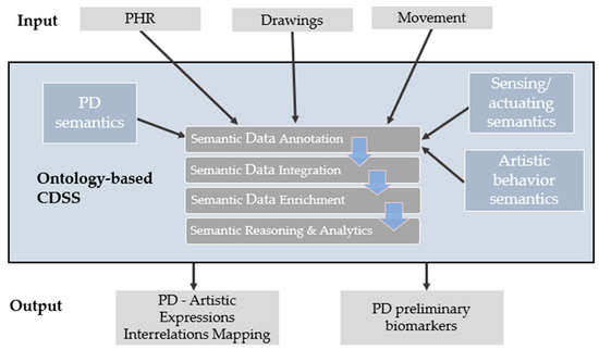 The previous section highlighted the lack of an ES/DSS that uses products of artistic expression, such as paintings, combined with other personal health data to enable the diagnosis and progression of PDs. Therefore, in this section, a framework for the detection of common mechanisms between patients with PD and those who possess artistic talents is proposed (Figure 4). The proposed framework utilizes semantic models based on fuzzy ontologies with the aim of creating an integrated representation of biological and artistic knowledge. To realize this framework, an ontology-based interlinking and decision support system must be developed and evaluated, emphasizing fuzzy semantics and biomedical/bioengineering data. The use of fuzzy semantics accommodates the uncertainty and imprecision often associated with PD and artistic expression, and it can help reveal patterns and connections that may not be initially apparent. Semantics (ontologies) play a critical role in this framework, providing a structured formal and explicit representation of the data and facilitating the identification of relationships between different concepts. Moreover, ontologies are used to link various data sources, leading to a more complete understanding of the relationship between PD and artistic behaviors. The proposed system takes interconnected data and fuzzy semantics as inputs and determines (a) if PD and artistic behavior interrelations exist and (b) if preliminary PD biomarkers are present.