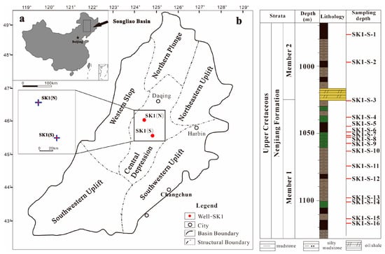 (left): (a) Location of the Songliao Basin in China; (b) the main structural divisions of Songliao Basin and drilling sites of SK-1(S) and SK-1(N). (right): Lithology and sampling depth of K2n1+2 in SK-1(S).