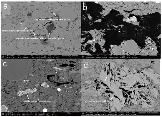 Field emission scanning electron microscope (FE-SEM) was used to observe the 2D structure of the pores. Before the samples were observed under the microscope, argon ion polishing technology (Ar-BIB) was used to etch the surface of the samples (Leica RES102 Ion Milling System of Leica company, Wetzlar, Germany). The cross-sections of the samples were bombarded by three independent argon ion beams under a voltage of 7.0 kV and current of 2.6 mA. The polishing time was 5–7 h for each sample. The polished surface was crescent-shaped with an area of about 2 mm2. For SEM analysis (Apreo FE-SEM of FEI company, Hillsboro, USA, 5.0 kV, 0.40 nA), the samples were treated by carbon plating to make the surface conductive. Then the samples were placed in the electron microscope instrument, the distance between the SEM lens and the top of the sample table was adjusted to about 4 mm, and the backscattering mode (BSE) was used to observe the rock surface. Using a high-resolution electron microscope, the distribution of the organic matter, pore size, shape, contact relationship between the pores and organic matter was clearly observed. At the same time, the plane distribution of inorganic minerals, such as pyrite, and their contact relationship with the organic matter and pores were also observed [54,55,56] (Figure 2).
