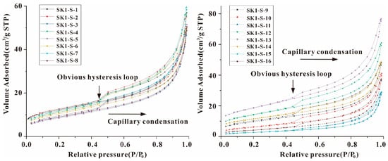 According to IUPAC classification, there are four types of N2 adsorption isotherms [61,62]. In this study, there were obvious hysteresis loops in the samples, and all of the hysteresis loops were closed. The existence of a hysteresis loop shows that evaporation from the pores is obviously different from condensation in the pores, and that capillary condensation occurs in mesoporous pores [71]. Useful information about the pore structure can be obtained from the shape of the hysteresis loop. The hysteresis loops of 16 samples were analyzed and it was found that there was only one type of hysteresis loop: type H3 (Figure 4). H3 hysteresis occurs with the accumulation of plate-like particles that produce slit-shaped pores, which corresponds to the slit-shaped and acicular intergranular pores of clay minerals observed under a scanning electron microscope (SEM) (Figure 2).