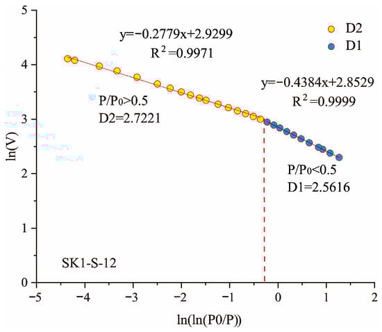 Figure 5 shows the FHH diagram of the sample SK1-S-2. At the relative pressures of 0–0.5 (R2 = 0.9999) and 0.5–1 (R2 = 0.9971), there are two different linear segments because the gas adsorption mechanism was different at different relative pressures (Appendix A) [63,72,73,74,75,76,77]. The characteristics of the pores were also different. Considering the difference in the gas adsorption behavior between < 0.5 and > 0.5, the fractal dimensions of the samples were calculated in these two regions, which are defined as D1 and D2. D1 is monolayer–multilayer adsorption controlled by van der Waals forces, and D2 represents the adsorption behavior controlled by capillary condensation at a higher [73,74,75,76,77].
