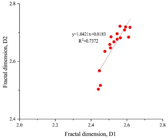 The range of the fractal dimension D1 was 2.4406 to 2.6174, and the average value was 2.5308. The fractal dimension D2 ranged from 2.5036 to 2.7197, and the average value was 2.6556. The fractal dimension D values were all higher than 2.5 (Table 4). These results indicate that the shale pores have good fractal properties in both their internal structure and surface. The D2 values were larger than the D1 values of the K2n1+2 shale samples, demonstrating that the pore internal structure has stronger complexity and heterogeneity than the pore surface, while the smaller pores have stronger complexity and heterogeneity than the larger pores. There was a positive correlation (R2 = 0.7372, T = 6.56, p = 0.00001) between D1 and D2 of K2n1+2 in the Songliao Basin, indicating that these two fractal dimensions can be used to characterize the pore structure and pore surface of the shale [51] (Figure 6).