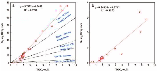 The S2 value of the K2n1+2 shale in the Songliao Basin varied greatly, with an average of 24.43 mg HC/g rock, ranging from 0.39 to 75.41 mg HC/g rock. The content of TOC ranged from 0.3 to 8.74 wt.%, with an average of 3.21 wt.% (Table 4). The S2-TOC diagram shows that there is type I kerogen in the shale of K2n1+2 [45] (Figure 7). S2 and the TOC had a good linear correlation, and the correlation coefficient was R2 = 0.9781 (Figure 7). The slope (S2/TOC) indicates that the trend-based HI (hydrogen index) had a value of about 980 mg HC/g TOC (Slope × 100 = HI = 980 mg HC/g TOC), and the sample was of type I kerogen oil-prone.