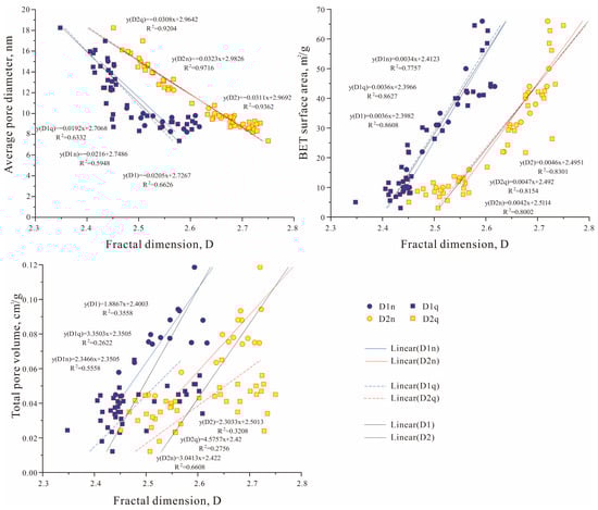 The fractal dimension D1 ranged from 2.4406 to 2.6174, with a mean value of 2.5308. The fractal dimension D2 ranged from 2.5036 to 2.7197, with a mean value of 2.6556. The fractal dimensions indicate that the shale pores have good fractal properties in both internal structure and surface, the internal structure of the pores has stronger complexity and non-homogeneity than the surface of the pores, and the smaller pores have stronger complexity and non-homogeneity than the larger ones. The BET specific surface area of the samples ranged from 9.69 to 65.91 m2/g, the pore volume ranged from 0.0444 to 0.1187 cm3/g (average 0.0768 cm3/g), and the average pore size was 8.22–15.40 nm (average 10.10 nm). The average pore diameter of the shale of K2n was negatively correlated with the fractal dimensions D1 (R2 = 0.5948, T > 2.58, p < 0.01) and D2 (R2 = 0.9716, T > 2.58, p < 0.01), indicating that the fractal dimension increases with the decrease in the average pore diameter (Figure 8). This trend is consistent with the shale data of the Qingshankou Formation recorded by Wang et al. and Cao et al. [51,78]. The lacustrine shale samples with higher D2 values had a more complex pore structure, which may be due to the fact that the shale samples with a smaller average pore size also contained more micropores.