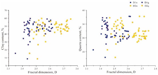Through a comparison of the mineral content and the fractal dimensions, it was found that there was no correlation between the quartz and the fractal dimensions. Although the fracturing of quartz could further induce development of the pore space and gain more storage space, quartz may not be the main factor affecting pore development in the samples of this study. There was also no clear correlation between the clay minerals and fractal dimensions, indicating little or no correlation between the clay minerals and fractal dimension D1 (R2 < 0.2, T > 1.96, p > 0.05) and weak correlation between the clay minerals and D2 (R2 > 0.2, T > 1.96, p < 0.05, Figure 9). It is interpreted that the contribution of clay minerals to the pore structure complexity of K2n1+2 shale is limited. This is consistent with the Qingshankou formation results (Figure 9).