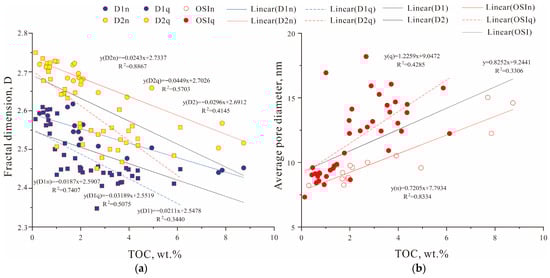 (a) Relationship between TOC content and fractal dimensions D1 and D2 of K2n1+2 and K2q shale samples. (b) Relationship between TOC content and average pore diameter of K2n1+2 and K2q shale samples. The K2q compared to [78].