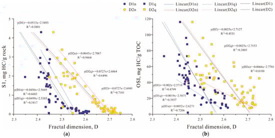 There was an obvious linear negative correlation between S1, OSI, and the fractal dimensions of the shale of K2n1+2. The correlation between S1 and D2 (R2 = 0.9464, T > 2.58, p < 0.01) was better than that of S1 and D1 (R2 = 0.6603, T > 2.58, p < 0.01), indicating that D2 can be used to characterize the oil content of shale (Figure 11). This is consistent with the negative correlation shown between the Qingshankou Formation S1 and the fractal dimensions (Figure 11, R2D2q > R2D1q). Shale samples with higher free oil levels always have a lower fractal dimension D2 value, which may be due to the fact that free oil is mainly stored in large pores, and these pores have lower D2 values. Contrary to shale gas adsorption, the molecular diameter of shale oil is much larger than that of shale gas. Therefore, shale oil is intelligently stored in pores with larger diameters, which causes the phenomenon that shale with higher free oil content usually has lower D2 [51]. As a result, combining the influence of the TOC content on the fractal dimensions and the relationship between the free oil and fractal dimensions, we conclude that the best area for exploitation in the low maturity shales of the Nengjiang Formation in the Songliao Basin would be the area with lower pore fractal dimensions and higher TOC content.