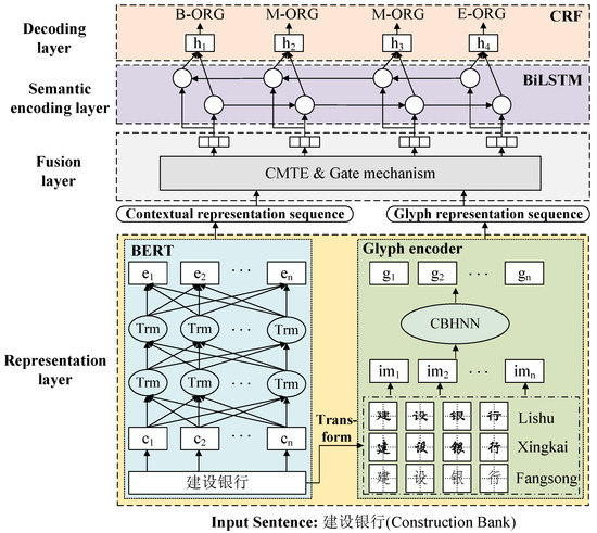 In English, words with the same prefix or suffix can often be classified into one category. For example, words such as geologist, pianist and physicist have the suffix “-ist”, which can represent entities engaged in a certain occupation. Chiu and Ma et al. [7,8] used a convolutional neural network (CNN) to capture the spelling features of prefixes and suffixes in English words; experiments showed that these spelling features can enhance the model’s understanding of word semantics and improve the recognition performance of the NER model. Large-scale pre-trained language models, such as BERT [9] and GPT [10], use the word-piece method to split a word into multiple pieces, which can effectively express out-of-vocabulary words while reducing the size of the vocabulary, thus improving the semantic representation ability of the model. Different from English, Chinese characters are ideographic characters and have no prefix, suffix, root and other characteristics of English words. Chinese characters evolved from hieroglyphs, and their glyph structure contains rich semantic information. For example, “花 (flower)”, “荷 (lotus)” and “茶 (tea)” all contain the radical “艹 (grass)”, indicating that these three characters are related to herbaceous plants. This means that when there are characters out-of-vocabulary, we can deduce the approximate semantics of out-of-vocabulary characters from the glyph features of Chinese characters, such as radicals. At the same time, in Chinese naming culture, it is also preferred to use radicals with Wu-Xing (five elements) or positive meanings as part of the name. For example, radicals such as “火 (fire)” and “日 (sum)” often appear in names, while radicals such as “疒 (epilepsy)”, which represent diseases, rarely appear in names. These patterns may be useful for identifying the Chinese names of people and businesses. Moreover, Chinese characters are mostly polysemous, meaning that one Chinese character has multiple meanings, and most of them need to be combined with other Chinese characters into words to have a more clear semantic representation. For example, the Chinese character “行” in “银行 (bank)” and “爬行 (crawling)” have completely different semantics. In “银行”, “行” is a noun, indicating an institution, while in “爬行”, “行” is a verb, indicating walking. Moreover, the potential word formation knowledge between the glyphs of adjacent characters can enrich the semantic information of Chinese characters and alleviate the problem of polysemy. For instance, in “爪” (often representing an action related to the hand), the radical of “爬”, can help to express that “行” is a verb, indicating the meaning of walking. However, most of the existing Chinese NER models focus on the contextual semantic features of the character, and ignore the rich semantic information contained in the Chinese character glyph.