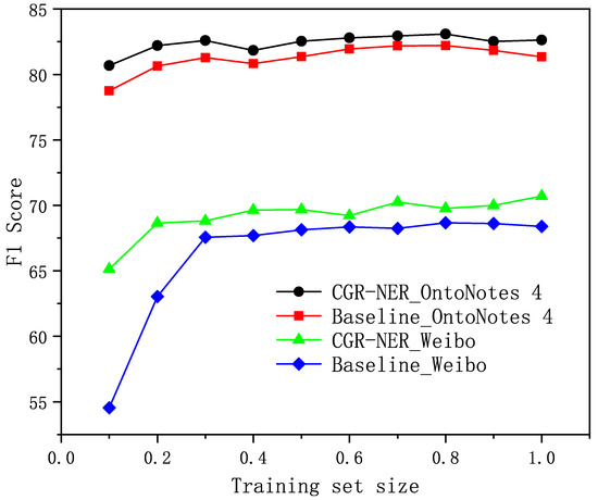 To verify the performance of CGR-NER under the condition of insufficient training data, we randomly select 10∼90% samples from the training sets of the Weibo and OntoNotes 4 datasets as the training set, respectively, while keeping the development set and test set unchanged, and we use BERT-BiLSTM-CRF as the baseline to compare with CGR-NER. As can be seen from Figure 5, the performance of CGR-NER surpasses that of BERT-BiLSTM-CRF under different training set sizes, indicating that CGR-NER has a stronger learning ability. In addition, we can find that CGR-NER has a more obvious improvement effect on the Weibo dataset. When the training data amount is 10%, the F1 score of CGR-NER on the Weibo dataset is improved by around 10% compared with BERT-BiLSTM-CRF. This is because the corpus of the Weibo dataset is collected from social media, the total amount of data is small, and the text format is chaotic, making entity recognition more challenging. At the same time, the glyphs of Chinese characters can be used as a data supplement to provide additional semantic knowledge for CGR-NER, so that CGR-NER can still have an excellent fitting ability in the case of insufficient training data.