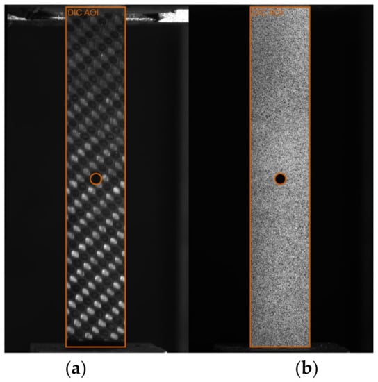 Tensile tests were conducted with an Instron 8001 hydraulic universal testing machine with a procedure adapted from the ASTM D3039 standard [22], at a quasi-static displacement rate of 2 mm/min. At least three specimens for each configuration were tested and mean values were considered. The free span of the specimen between the grips measured 145 mm. All tests were recorded with an 8.9 MP stereo camera system, imaging the entire specimen. In order to perform DIC, the specimens were airbrushed with a black-on-white speckle pattern (Figure 1b). Before painting, pictures of the bare specimens on the test fixture were taken (Figure 1a), to be used later to build the FEM model. The speckle images were processed using Correlated Solution’s VIC 3D 9.1.6 DIC software, selecting an optimal subset size of 31 px and a step between the subsets of 6 px, which is less than 1/3 of the subset size in accordance with [23]. The load was measured with a 100 kN load cell, while DIC was used to monitor displacement and strains on the specimen surface.