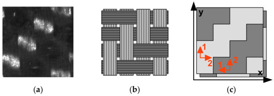 A simplified mesoscale numerical model was developed, which accounts for the heterogeneity of the material under study to correctly predict the strain and stress localization. The complex strain distribution observed in woven composites originates from the orthotropic fiber bundles (tows) interlocking in perpendicular directions. This structure, which needs to be described in the model, is visible as it appears on the surface of the specimen in Figure 2a and schematically in Figure 2b.
