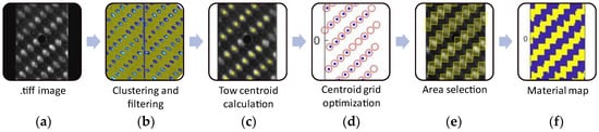 At first, a map of the vertical and horizontal fiber tows on the outer face of the specimen was built via a MATLAB script by processing the image of the specimen surface taken immediately before the test. The coordinates of every point on the specimen surface were determined with calibration of the stereoscopic DIC. Figure 3a shows a detail of the specimen, while Figure 3b–f illustrates the process developed to build its material map. Thanks to their differences in terms of reflectivity, in the grayscale images, the tows of fibers emerging to the surface appear brighter when oriented along the vertical direction than along the horizontal direction. Using a K-means clustering algorithm operating on the grey level of the image, defined with integer values between 0 (white) and 255 (black), the tows were identified. The most straightforward method was found to divide the image into three clusters, and to flatten the two least numerous into one, giving good tow identification. Smaller, unrelated clusters were filtered out to remove noise. The centroids of the main clusters were assumed to be the centers of the fiber tows, with their coordinates defined with DIC. The map was first built by fitting a geometrically exact grid to these points using optimization to determine its x-y spacing and the in-plane rotation angle. In the next step, the full map of the two material orientations was constructed building rectangles around the tow centers, with dimensions obtained from the optimized grid spacing.