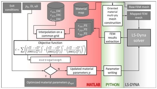Another application of full-field strain measurements is the determination of parameters for material models, once again using mixed experimental-numerical methods [9,16,17,18,19]. These methods are usually a variant of the so-called Finite Element Model-Updating schemes. A Finite Element Model (FEM) is iteratively solved, and the resulting strains in output are compared to the experimental ones in an objective function, appropriately formulated to evaluate the discrepancy in the specific problem. At every step, an optimization algorithm updates the model with the values of the material parameters to be identified, attempting to minimize the objective function. When a pre-determined convergence criterion is reached, the resulting optimized parameters are retained [16]. This approach has already been used by [20] at a theoretical proof-of-concept level to identify material properties of microscale composite constituents.