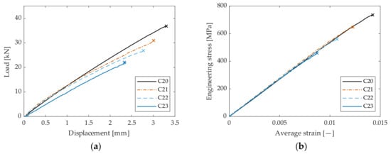 Experimental mean curves are shown in Figure 5. In the load-displacement plot (Figure 5a), which uses data from the test machine’s load cell and displacement transducer, the specimens display different stiffnesses and maximum loads. As expected, both stiffness and maximum load are highest for the plain specimen, and decrease following hole size. In the stress-strain plots (Figure 5b), all specimens show a similar tensile modulus, whereas hole size affects the nominal ultimate tensile strength of the specimens. The strain values reported were computed by averaging the DIC surface strain over the entire specimen AOI, while the engineering stress value was computed as the ratio between the applied load and the unnotched section area. All specimens showed mostly linear behavior throughout the test, with some non-linearity arising before the final failure. A brittle failure along a line passing through the hole was observed for all the tested specimens.