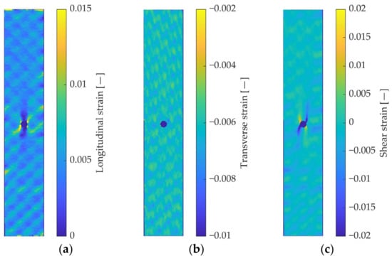 DIC-determined strain fields: (a) longitudinal strain; (b) transverse strain; (c) shear strain.