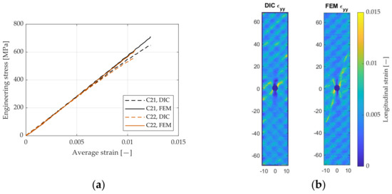 To validate the mesoscale model calibrated with the data-driven procedure, the identified properties were used to model a notched specimen in a mesoscale fashion. A constant displacement rate was applied to the specimen and the global stress and strain curves from the tensile tests, and the strain maps were compared with the experimental results. As shown in Figure 7, the FE model well captures the elastic behavior of the tested specimens, thus validating the obtained material properties. This can also be appreciated through the comparison of the strain map in the longitudinal direction reported in Figure 7b. The model is able to capture the strain variation to a good degree due to the material heterogeneity which combines with the strain intensification in the proximity of the circular notch. The diagonal banding effect in the strain field is also well represented, including the opposite direction diagonal banding due to the 90° layer.