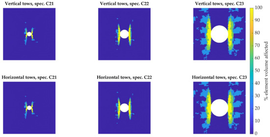 The affected volume scales up with the hole diameter. Interestingly, the interaction of the stress concentration with the non-homogeneous material structure can be also observed. For specimens C21 and C22, with respective hole diameters of 2 and 4 mm, both smaller than the 5-mm tow size, the stress concentration remains localized. On the other hand, in specimen C23, with its 8-mm diameter hole, the notch is not contained within a tow and more than one diagonal row of tows is interrupted.