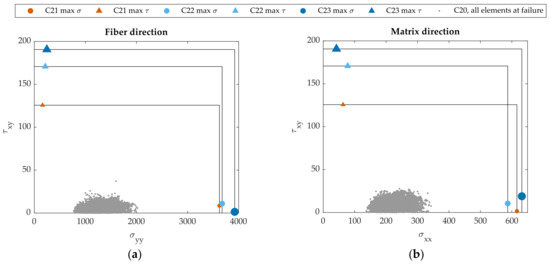 Plots of the stress state values at the most heavily loaded elements at failure on (a) the - plane (fiber direction in the material); (b) the - plane (matrix direction in the material). The grey cloud contains all stress states of the elements in the plain specimen at failure.