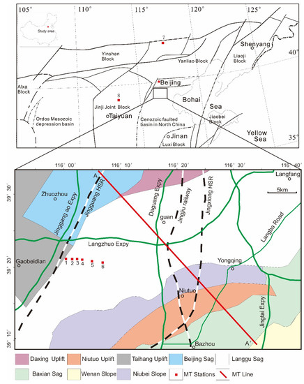 The magnetotelluric (MT) method is an exploration tool that calculates impedance by observing the natural instantaneous electromagnetic field on the ground, allowing one to study the electrical structure of the underground rock [1,2,3,4,5,6]. The MT method has the advantages of deep exploration, easy operation, and a lack of shielding from high-resistance layers, meaning that it can be used in research fields investigating topics such as lithospheric structures, oil and gas exploration, seismic prediction, and geothermal exploration [7,8,9,10]. Therefore, in the process of deep geothermal exploration in the Jizhong depression, the MT method was used to detect deep geological structures and regional structural frameworks.