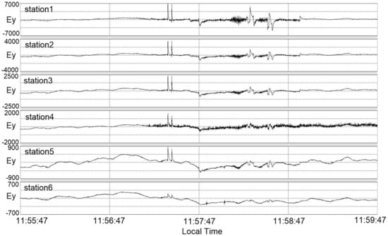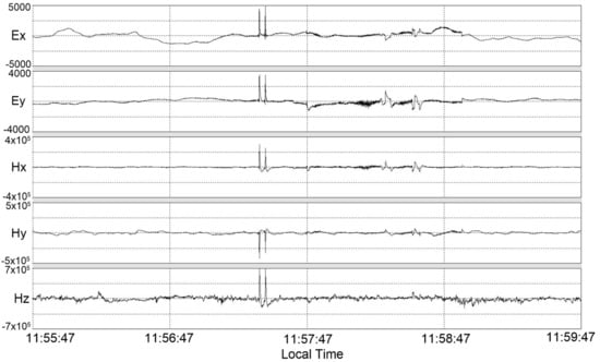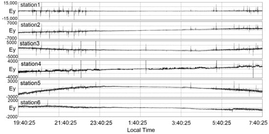 Figure 2 shows the time series of the Ey components collected by stations 1–6 at around 12 noon on 19 April 2019, local time. In the time series for the distance of 0.5 km to 5 km from the railway line, we can see impulse, charging–discharging, and triangular-wave noise. The curve jump is obvious, and its amplitude is several times or several orders of magnitude that of the natural field signals. Such noises will cause an incorrect estimation of the transfer function. As the distance increases, the noise amplitude gradually decreases, but there are still noise signals at 5 km. Figure 3 illustrates the five components collected by station 2 at around 12 noon on 19 April 2019, local time. The HSR noise has almost the same effect on all the components. The 12 h time series (Figure 4) recorded by station 2 from 19 to 20 April 2019, local time, shows that there are almost no impulse, charging–discharging, or triangular-wave signals from 0 am to 6 am, and the amplitude is several times or several orders of magnitude smaller than that of the HSR operation period at noon. This is because various equipment of the HSR is being overhauled and trains are not running during this time. Therefore, it is better to conduct measurements at night so as to avoid HSR noise.