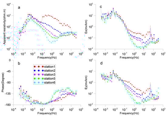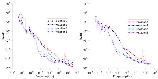 Figure 5 shows the frequency domain curves of different distances from the BGHSR. Figure 5a,b shows the apparent resistivity and phase in the y–x direction. It can be seen that the curve of station 1 is distorted from 100 Hz. For stations 2–6, the apparent resistivity and phase curves tend to overlap in the frequency range from hundreds of Hz to 10 Hz. The apparent resistivity curve below 10 Hz first decreases and then rises at a slope of nearly 45 degrees, and the phase curve tends towards −180 degrees. These are the near-field and transition zones defined by the controlled-source audio-frequency magnetotelluric method (CSAMT) [30,31,32]. As the distance increases, the frequency entering the transition zone gradually decreases, and the curves gradually separate. The apparent resistivity in the frequency range below 0.01 Hz decreases, the phase begins to rise, and the curves gradually return to normal and tend to overlap again. Figure 5c,d shows the electric field spectra in two directions. The high-frequency and low-frequency bands tend to overlap, which indicates a normal transfer function curve. In the mid-frequency band of 10–0.01 Hz, the electric field curve in the two directions and the yx apparent resistivity curve show the same trend of change, which first decreases and then rises sharply before gradually returning to normal after 0.01 Hz. Figure 6 shows the amplitude of the magnetic field. The left is Hx, and the right is Hy. Stations 2 and 5 exhibit HSR noise signals, while stations 7 and 8 are remote references and do not exhibit HSR interference signals. The amplitudes of stations 2 and 5 are very similar. Correspondingly, the amplitudes of stations 7 and 8 are very similar. The magnetic field amplitudes of stations 2 and 5 are almost an order of magnitude higher than those of stations 7 and 8 in the 10–0.01 Hz band, but these four stations are relatively close in terms of the other frequency bands. From the above analysis, it can be seen that BGHSR mainly interferes with the MT signals in the mid-frequency band of 10–0.01 Hz.