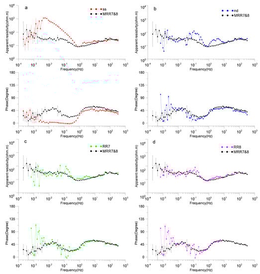 Plots of apparent resistivity and phase data of station 2. Red curves denote the single station (ss), blue curves denote nocturnal data (nd), magenta curves denote station 8 as a remote reference (RR8), green curves denote station 7 as a remote reference (RR7), and black curves denote stations 7 and 8 as remote references (MRR7&8). (a) Comparison of ss and MRR. (b) Comparison of nd and MRR. (c) Comparison of RR7 and MRR. (d) Comparison of RR8 and MRR.
