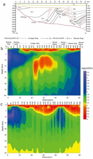 We used the impedance tensor decomposition technique for the profile data and calculated the direction of the electrical principal axis. After rotating the impedance tensor towards the geo-electric strike direction, the data of the transverse electric (TE) and traverse magnetic (TM) modes were obtained. The nonlinear conjugate gradient method (NLCG) implemented in WinGlink software was used for two-dimensional inversion [36]. The frequency range we used was 433–0.001 Hz. Frist, the poor-quality data were removed, and then the 2D inversion of the TM, TE and TM + TE modes of the apparent resistivity and impedance phases were performed [37,38]. The initial model was constructed with a uniform half-space of 100 Ωm. The data were inverted with the regularization parameter τ = 10. The inversion results of the three modes were analyzed by referring to the geological and geophysical information of the survey area. Finally, the TM + TE mode inversion result was selected because it was more consistent with the actual geological conditions. The inversion of the MRR data was completed with an RMS misfit of 2.34 after 99 iterations. The inversion of the SS data was completed with an RMS misfit of 2.24 after 103 iterations. In general, a sharp change in resistivity is often a sign of fracture or lithologic interface, where a slow change corresponds to a stable and uniform electrical layer. Therefore, the image of the contoured resistivity section can reflect the distribution law of the resistivity of the underground half-space medium along the survey line, that is, the electrical structure model of the profile. Figure 8b is a two-dimensional inversion section based on data with MRR, which clearly shows the lithologic units. From west to east, it corresponds to the Beijing sag, Daxing uplift, Langgu sag, Niutuo uplift and Baxian sag.