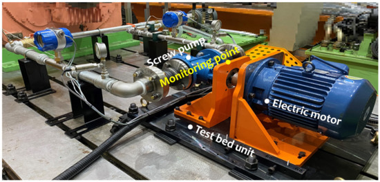 The pump test bed is designed to control normal and abnormal characteristics precisely. In line with the advice of the manufacturer, the test facility was optimized and upgraded to verify its suitability for the test. More specifically, the piping design conditions were optimized to stably implement the operating conditions (flow rate, etc.) of the target device by performing a preliminary operation. In addition, uncertainty-inducing factors, such as cavitation, that could affect the operating environment were eliminated to accurately control and measure the flow rates. Using the installed sensors, the database was obtained considering environmental parameters such as temperature and pressure flow. In addition, the additional failure response for vibration and noise was acquired. The data were collected and stored in CSV data files through simultaneous modules such as the DAQ Card module and Sinus Apollo Light module [22]. Table 5 presents information about the manufacturer and operating conditions of the pump test bed. The test bed was prepared using a screw pump (KRAL company), which is commonly used in ships. Then, a trial test was conducted to confirm whether the performance and safety of the equipment were secured and whether the operating environment could be reproduced. Fault test diagnostic data acquisition and system control software was configured to enable monitoring of driving data 16CH and vibration characteristic data 8ch. In addition, the operation of the development SW enabled real-time analysis of acquisition signals, such as the acquisition of failure diagnostic data for each failure scenario and FFT analysis. Vibration data were used in real-time monitoring of high frequency bands using Amadeus software (FAMTECH), and the application of the condition-based monitoring system was verified by comparing data using the development software. The test was conducted three times for 900 s.