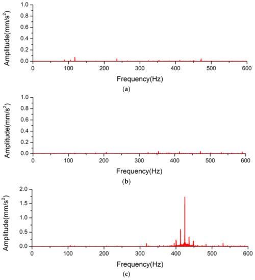 FFT for (a) normal state and abnormal states such as (b) without lubrication and (c) contamination of the motor bearing.