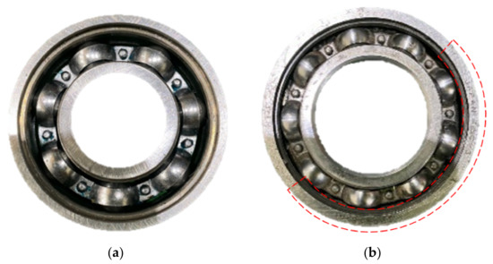 Figure 4 shows examples of wear, scratches, and dents that appear on the bearing by comparing the conditions prior to testing and the tested conditions. After the test, several scratches and dents were found in several places on the motor bearing. In particular, the wear, scratches, and dents appeared on the outer surface of the inner ring and on the inner surface of the outer ring after the test.