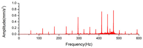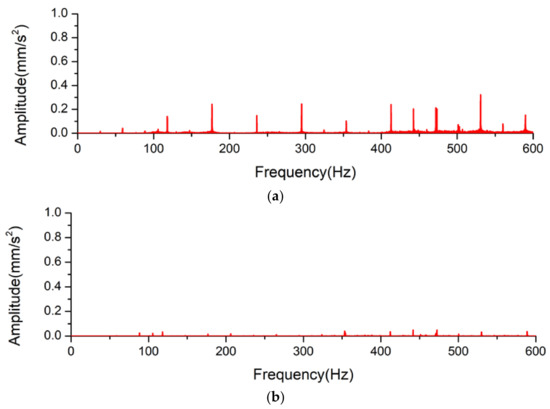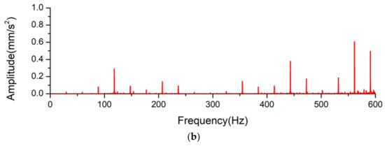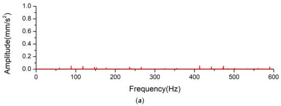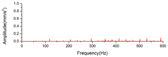 Figure 5 shows the FFT for abnormal states such as breakage of the elastic body and misalignment of the coupling. When comparing the vibration data between normal operation (see Figure 4a) and breakage of the elastic body, the frequency band showed a similar trend. That is, even though some part of the coupling was broken, the overall vibration trend was similar to the normal state of the coupling. However, in the case of the misalignment of the coupling, the amplitude significantly increased in the overall frequency ranges. In particular, the amplitude near 550 to 600 Hz in the radial direction increased significantly.