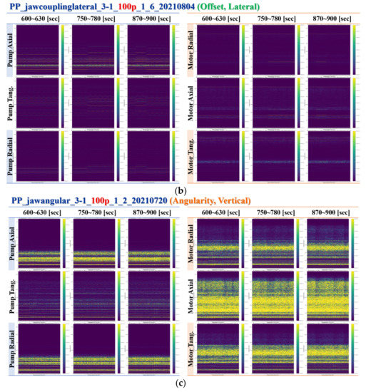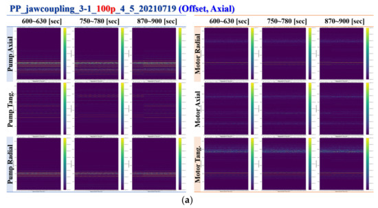STFT is a technique that analyzes rapidly changing data, such as vibration or noise, in the time–frequency domain. After dividing the data into regular time units, Fourier Transform is applied to each time unit. As the data is divided into units of time and analyzed separately, it is possible to simultaneously analyze the time and frequency domains, and the result can be used as two-dimensional data. STFT was performed considering the time unit for the severe scenario of abnormal conditions, such as the contamination state of the bearing, in various conditions of the coupling, and finally for the cavitation of the screw. Vibration data for 300 s were acquired using the accelerometer. The STFT results of dividing the data at regular time intervals and proceeding with FFT are shown as a result of combining the data over time. The x-axis is the time domain, and the y-axis is the frequency domain, indicating the change in amplitude in the frequency domain over time. In the case of the accelerometer, vibration data were obtained on the pump and motor sides, and through this, both cases were presented.