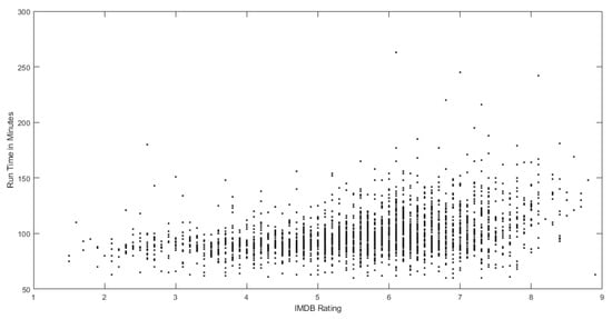 Relationship between IMDB Rating and Run Time in Minutes.
