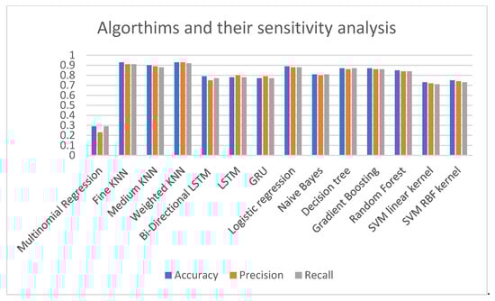 This study employed multiple KNN variants, including fine KNN, medium KNN, and weighted KNN. Table 6 displays the number of neighbors, the distance metric formula, and the distance weight for each type. The fine KNN has one neighbor, while the medium KNN has two, and the weighted KNN has 10. Fine KNN, medium KNN, and weighted KNN all employ Euclidean distance for their distance metrics. The equal distance (no distance weight) is used for fine KNN, medium KNN, and weighted KNN, while the squared inverse is used for weighted KNN. Further, other machine learning algorithms were implemented to compare the results and deduce certain features of the corresponding algorithm that may be considered for future adoption.