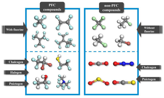 The materials database utilized in this study contains both PFC and non-PFC compounds (Figure 2, Figure S1 and Figure S2). A total of 150 PFC compounds, including 13 compounds that were not included in our previous database of 137 compounds, were designed to obtain a comprehensive PFC-based database with a broad array of fragments, such as chalcogen, halogen, and pnictogen [20]. The newly added PFC compounds are represented by chlorotrifluoromethane (CClF3), hydrotrifluoromethane (CHF3), and tetrafluoromethane (CF4) [5,19,22]. In addition, 18 non-PFC compounds, including N2O, CO2, SO2, CCl4, and CH4, were added to the PFC-based database with the aim of finalizing the database design process. The newly added non-PFC compounds also contained a broad array of fragments [5,9,19,22]. Notably, to provide guidance on design direction, information on compounds that exhibit relatively high dielectric strengths within the 168 PFC/non-PFC compounds analyzed are listed as follows: C4HClF8O, C4HF9O, C4H2F8O, and C5F10 with dielectric strengths higher than 3.0, exhibiting the dependence of the dielectric strength on the number of fluorine atoms. Furthermore, note that the primary objective of this study is to develop models capable of accurately predicting the dielectric strengths of both PFC and non-PFC organic compounds. Therefore, while acknowledging the significance of other properties, such as boiling point and greenhouse warming potential, in the development of insulating gas alternatives to SF6, our primary focus remains on reliably predicting the dielectric strengths of the compounds.