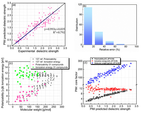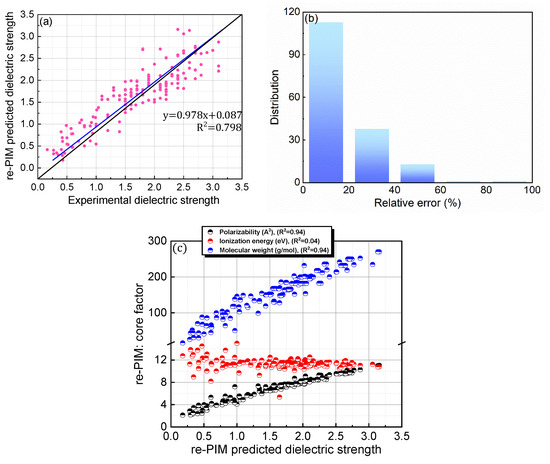 (a) Comparison of re-PIM-predicted and experimental dielectric strengths for 168 PFC and non-PFC compounds. (b) Distribution of relative errors for the re-PIM-predicted dielectric strengths. (c) re-PIM-predicted dielectric strengths as functions of the core factors (polarizability, ionization energy, and molecular weight).